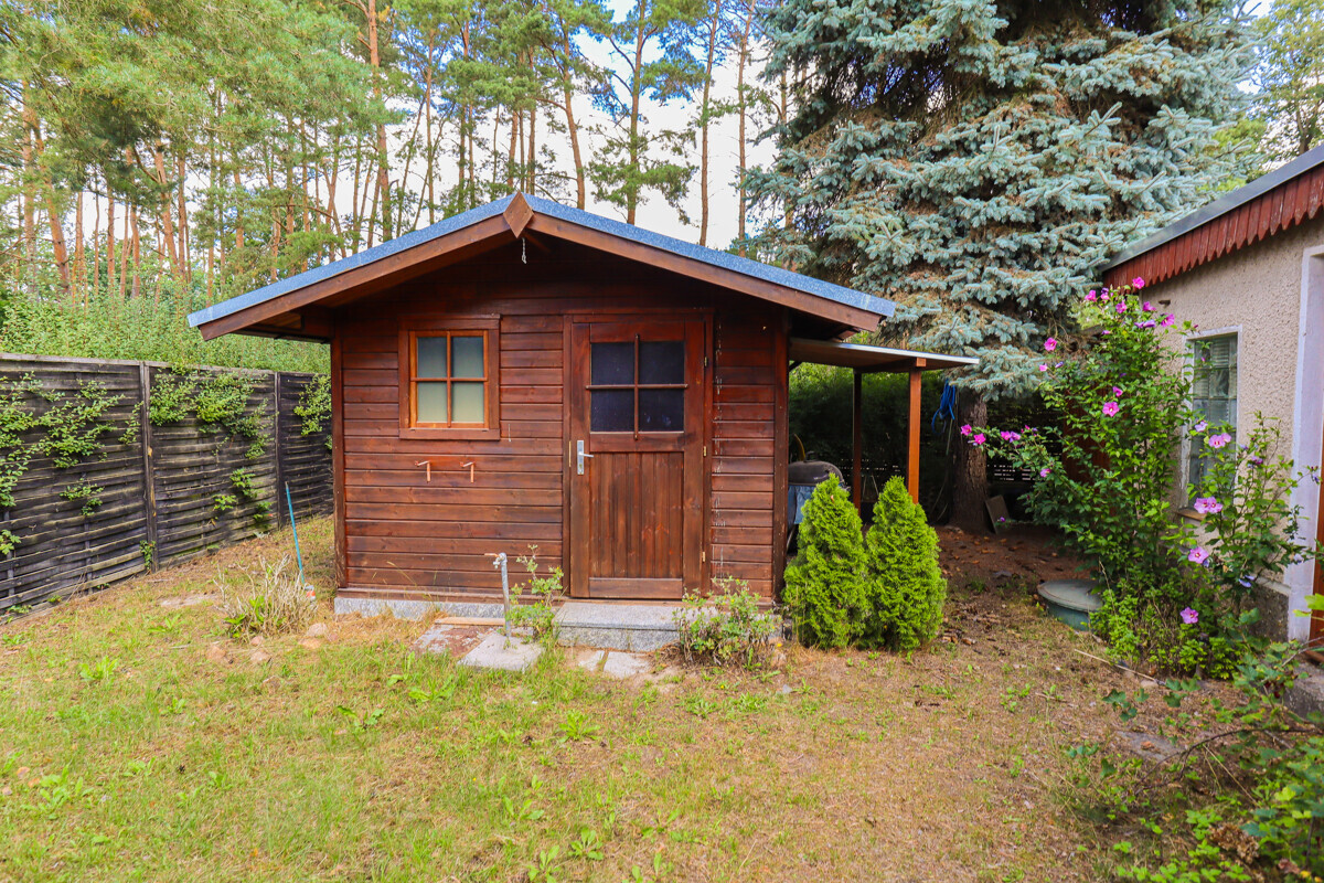 Für Gäste steht eine Holzhütte im Garten bereit – perfekt als Übernachtungsmöglichkeit oder für kreative Hobbys. Ein Carport (ca. 18m²) sowie eine separate Garage bieten Platz für Fahrzeuge und Gartengeräte.