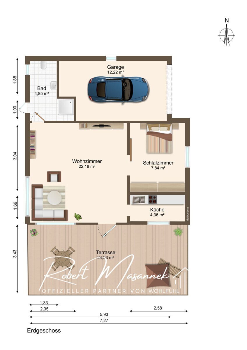 Ein echtes Highlight ist die fast 25m² große, überdachte Terrasse – ideal für entspannte Stunden mit Blick ins Grüne.