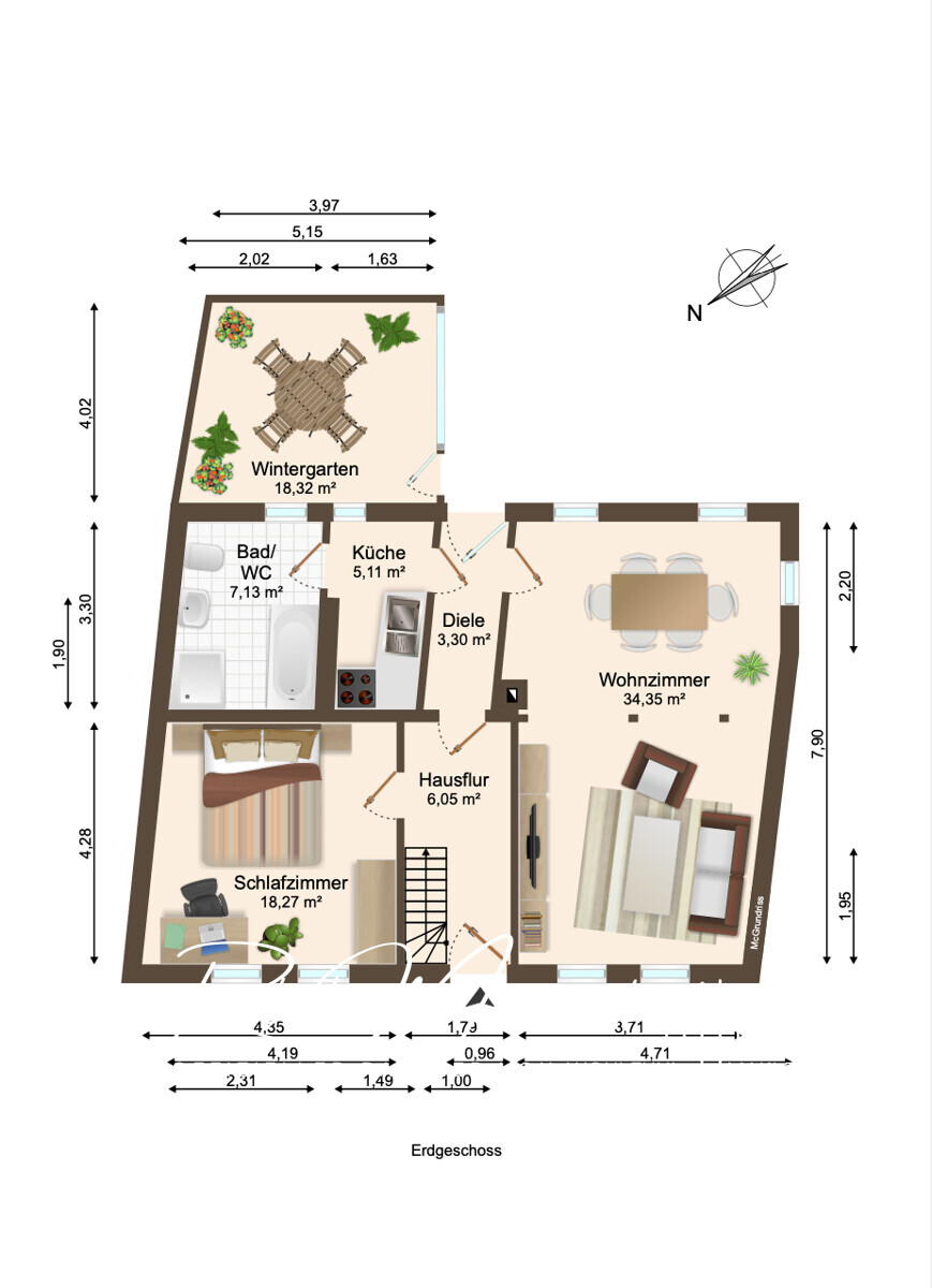 Die Erdgeschosswohnung (ca. 86,48 m²) umfasst ein großzügiges Wohn-/Esszimmer, Schlafzimmer, kompakte Küche, Bad mit Wanne und Dusche sowie einen 2004 errichteten Wintergarten, der sich vielseitig nutzen lässt – ob als zusätzlicher Wohnraum, Küche, Rückzugsort oder stilvoller Eingangsbereich.