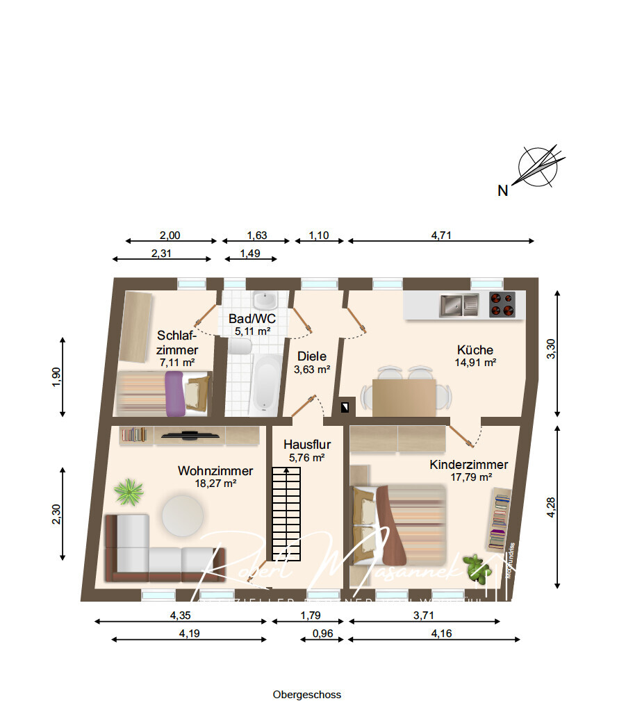 Die Wohnungen im Ober- (ca. 66,82 m²) und Dachgeschoss (ca. 62,89 m²) verfügen über 3–4 Zimmer, Küche und Bad; kleinere Schönheitsreparaturen ermöglichen individuelle Gestaltung.