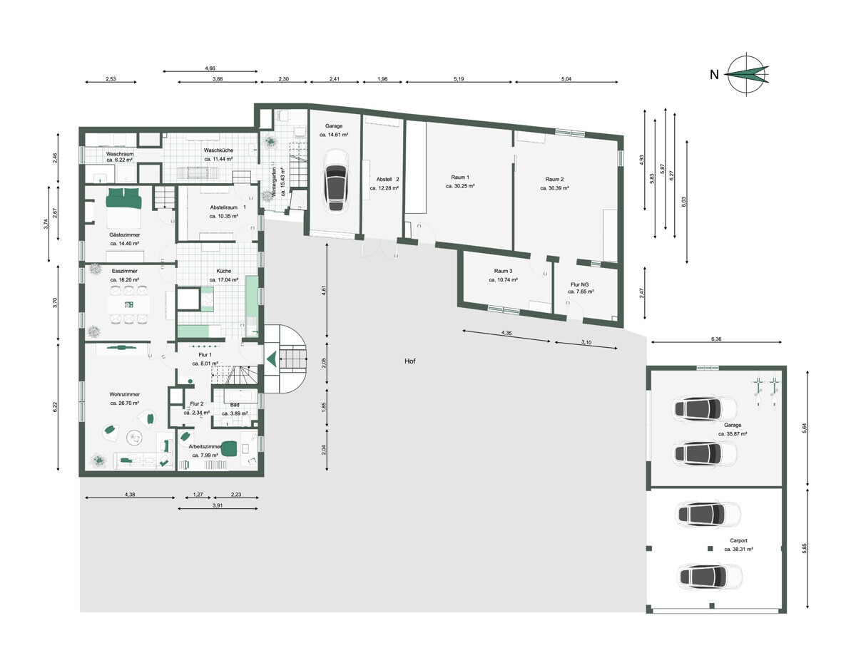 Für Fahrzeuge, Hobbys und handwerkliche Projekte ist bestens gesorgt: Eine Doppelgarage, ein Doppelcarport, eine weitere Garage sowie ein Nebengelass mit vielseitigem Nutzungspotenzial stehen zur Verfügung.