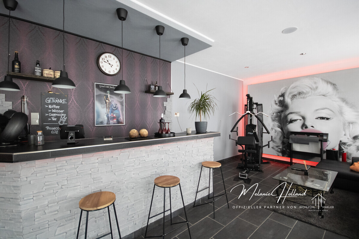 Vom Erdgeschoss aus gelangen Sie direkt auf das Grundstück mit großer Rasenfläche sowie massiv errichteten Nebengebäuden, die ebenfalls vielfältige Nutzungsoptionen bieten – etwa als Werkstatt, Lager oder erweiterte Gewerbefläche (je nach Genehmigung).