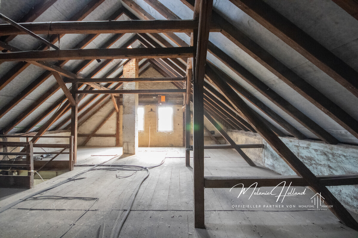 Das Dachgeschoss stellt das besondere Highlight des Hauses dar: Auf ca. 83,81 m² ausbaufähiger Fläche eröffnet die beeindruckende Raumhöhe die Möglichkeit, eine stylische Loft-Wohnung oder ein großzügiges Atelier zu realisieren (vorbehaltlich behördlicher Genehmigung). Ein Ort, an dem Visionen zu Wohn- oder Arbeitsräumen mit besonderem Flair werden können.